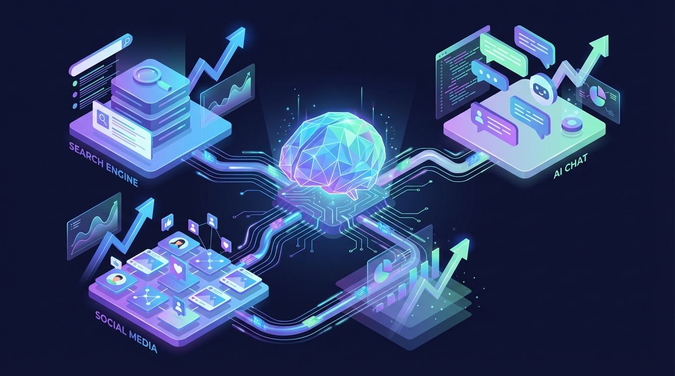 Search demands technical SEO, intent-mapped content, and fast pages. AI assistants surface answers from authoritative, well-structured sources. Social platforms reward engagement velocity, short formats, and creator-style storytelling. Running three playbooks manually creates gaps and conflicting priorities.