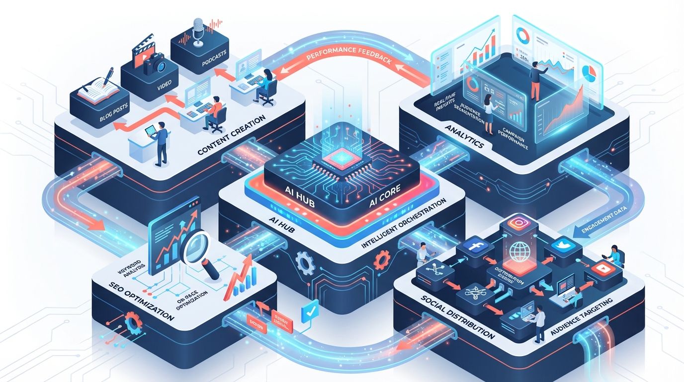 AI-powered inbound marketing automation is software that plans, produces, optimizes, and distributes content with minimal manual effort. It turns data into executed actions across your channels.