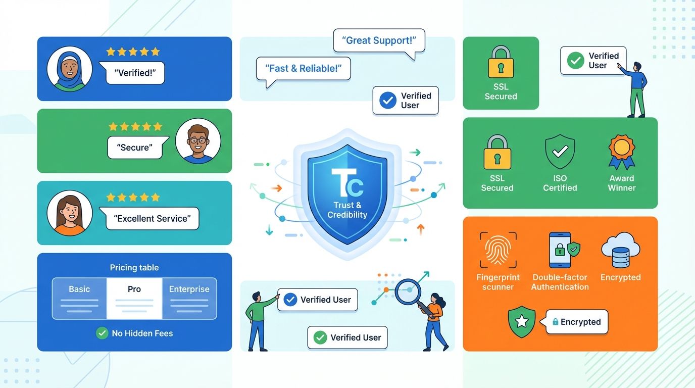 Verification is third-party proof that your claims are real. Certifications, compliance, reviews, and live stats validate your story.